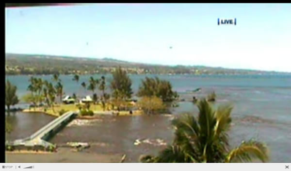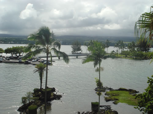 Spannend war allerdings die Situation in der Hilo Bay. Wir waren ja letztes Jahr in Hilo im Hilo Hawaiin Castle Hotel, das direkt an der Bay liegt. Das untenstehende Foto zeigt die Situation im August 2009: