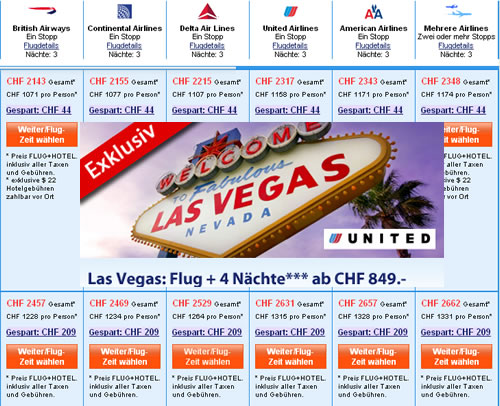 Nur leider habe ich auch mit mehreren verschiedenen Kombinationen kein Las Vegas Angebot für pauschal CHF 849.00 gefunden. Die Preise liegen mindestens zweihundert Franken darüber. Meiner Meinung nach handelt es sich bei dieser ebookers.ch Kampagne definitiv um ein Lockvogelangebot. Denn wer würde schon nicht für CHF 849.00 für 4 Tage nach Las Vegas fliegen?