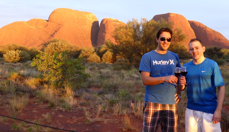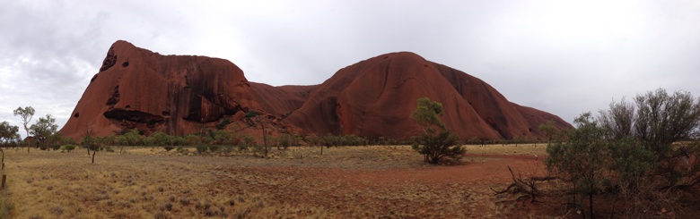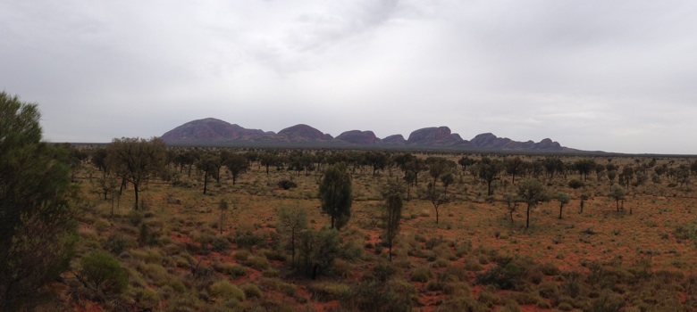 Um 14.30 Uhr wurden wir im Desert Gardens wieder abgeholt für die Valley of the Wings Wandertour. Wir fuhren zum Kata Tjuta National Park der einige Kilometer westlich des Uluru liegt. Dank dem „schlechten“ Wetter konnten wir die Wanderung machen, denn bei heissen Temperaturen ist es zu anstrengend und der Weg wird geschlossen. Die sechs Kilometer absolvierten wir Schweizer natürlich bravourös an vorderster Front der Gruppe. Vor allem der zweite Lookout mit Blick auf das Valley of the Wings entschädigte uns für die nichtexistente Sonne beim Uluru. Wieder unten im Tal gab es wieder ein Glas Wein und Crackers und oh Wunder für 5 Minuten kam die Sonne noch kurz durch die Wolken und wir erhaschten einen Beam auf die Kata Tjutas.